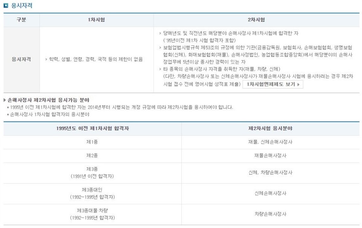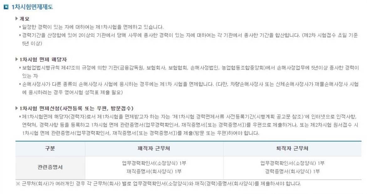손해사정사에서는 일정한 경력이 있는 자에 대해서는 1차시험을 면제하고 있습니다.