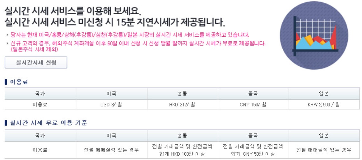 신규 고객의 경우는 해외 주식 계좌 개설 이후 60일 이내에 신청하면 신청한 달의 월말까지 실시간 시세가 무료로 제공되는 점 참고하세요. 무료 제공되는 내용 중에 일본 주식 시세는 제외됩니다.