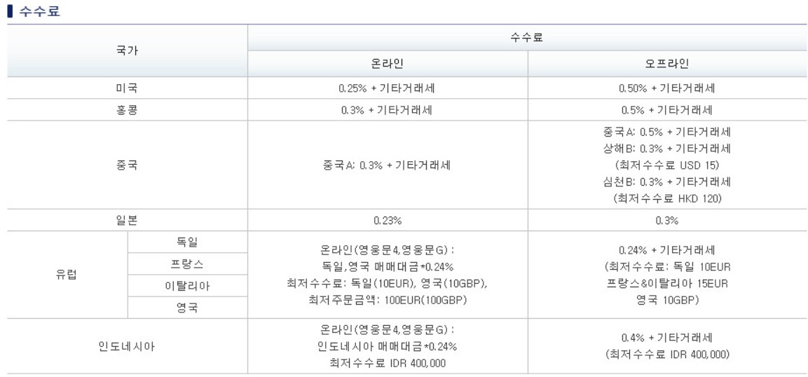 해외 주식은 국내 주식과 다르게 수수료를 매기고 있는데요, 미국은 온라인에서는 0.25% + 기타 거래세를 수수료로 내고 있고 홍콩과 중국은 0.3%, 일본은 0.23%에 수수료를 내야 합니다.