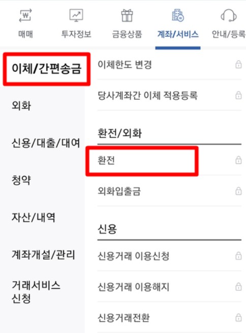상단에 [계좌/서비스] 탭에서 좌측 메뉴의 [이체/간편 송금] - [환전] 항목으로 들어가시면 됩니다. 이곳에서 원화를 여러 종류의 해외 통화로 환전 할 수 있습니다.