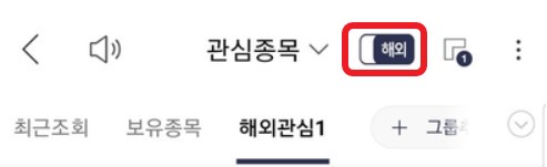 상단의 해외라고 써 있는 부분을 탭하면 국내와 해외를 변경할 수 있습니다. 해외 주식을 구매하려면 해외 탭에서 종목을 봐야겠죠?