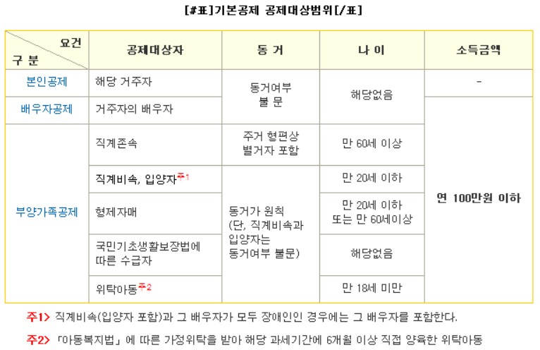 연말정산 부양가족 공제 항목이 많고 항목마다 조건이 다르기 때문에 본인이나 배우자가 기본공제요건에 해당하는지 아래 내용들을 보고 확인하시기 바랍니다.
