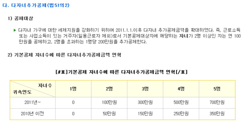 다자녀가구에 대한 세제지원을 강화하기 위해 다자녀추가공제 금액을 확대하였습니다. 2011년 이후부터는 자녀 수가 두 명 이상일 경우 위 표와 같이 추가 공제를 받을 수 있습니다.