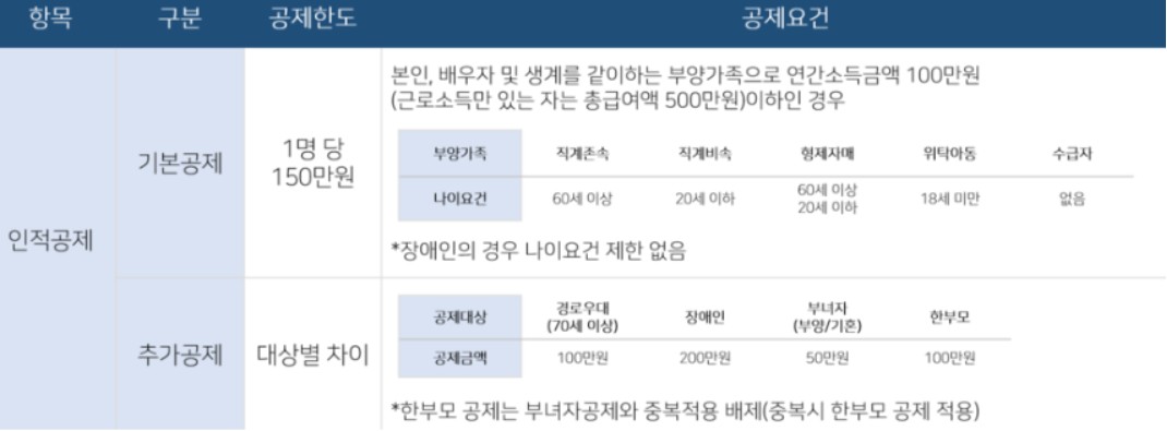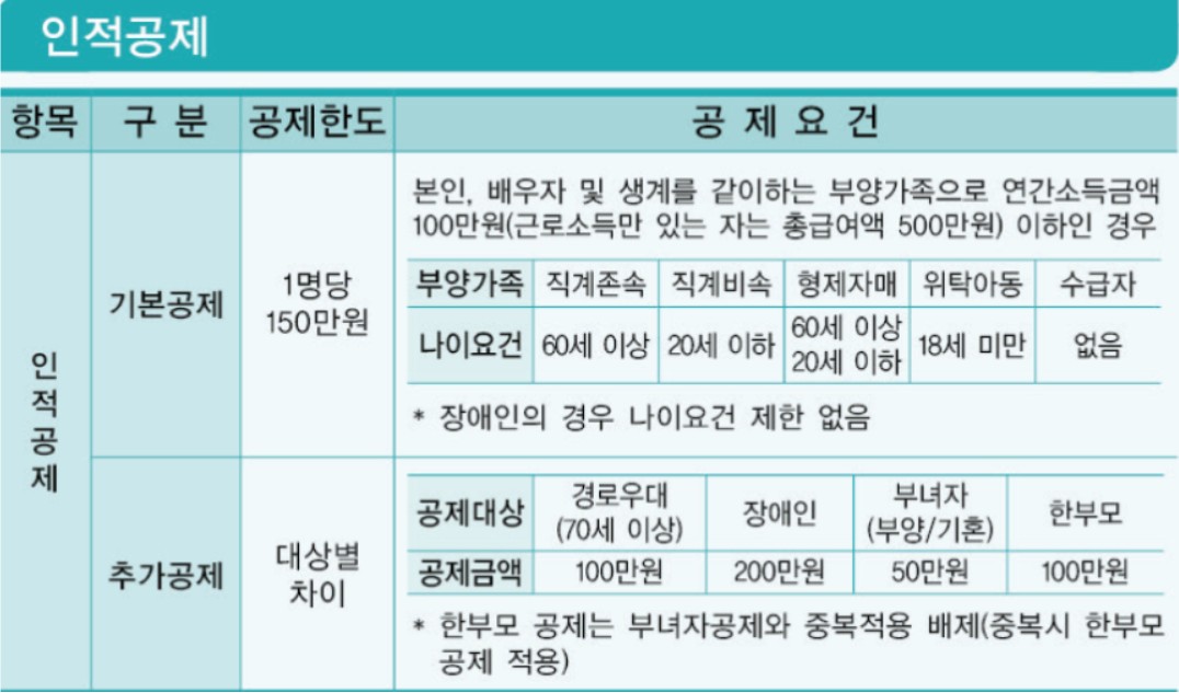 공제는 기본공제와 추가공제로 나뉘는데요, 기본 인적 공제 대상이 되려면 본인, 배우자와 동일한 주소지에서 생계를 같이하는 가족이어야 합니다.
