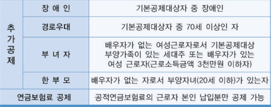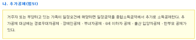 기본 공제 추가로 추가 공제도 받을 수 있는데요, 추가 공제를 받을 수 있는 종류는 총 여섯 가지가 있습니다.