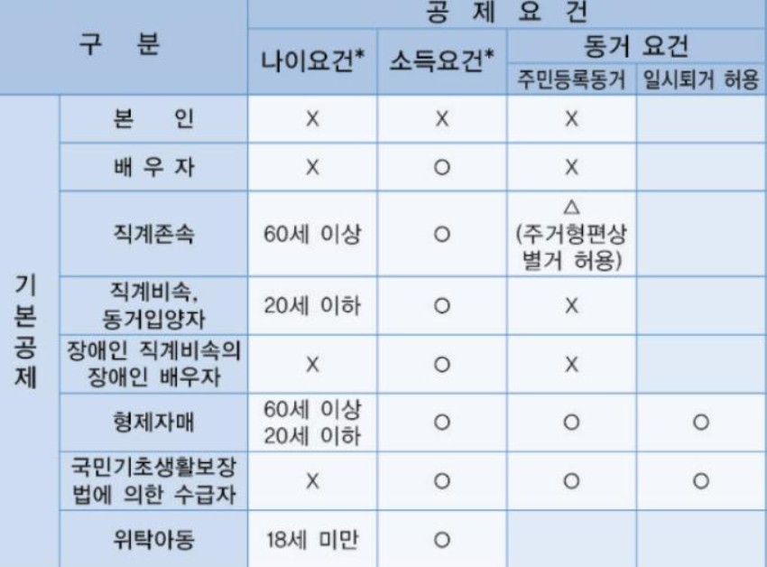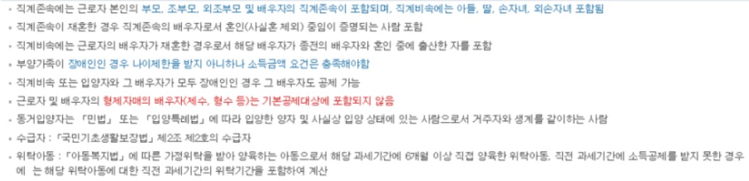 직계 존속과 직계 비속의 경우는요양이나 취학등 주거 형편에 따라서 분가를 했어도 공제 대상이 될 수 있습니다.