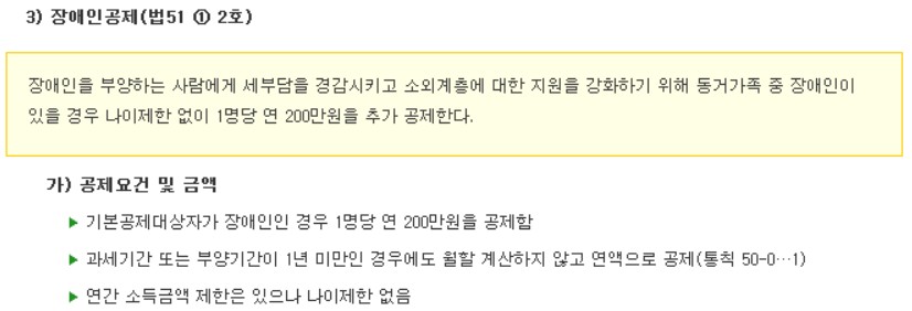 부양가족 기본공제 대상자가 장애인이면 한 명당 200만 원을 추가 공제받을 수 있습니다.