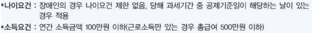 예외가 되는 항목도 있는데요, 가족 중 장애인 등록이 되어 있는 사람은 연령 제한 없이 연말정산 부양가족 기준 공제가 가능합니다.