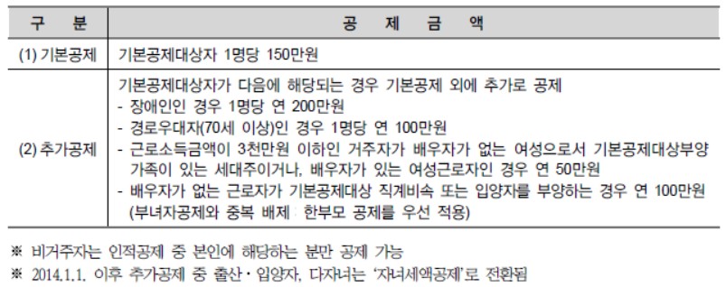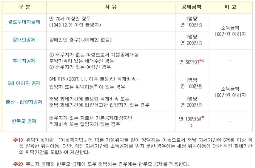 출산 입양자 공제회 경우 한 명 당 연 200만 원, 한부모공제의 경우 연 100만원이 공제금액을 공제받을 수 있습니다.
