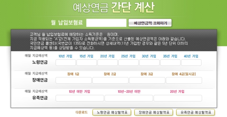 예상연금 모의계산을 하면 소득 및 가입 기간을 입력하여 예상 연금액을 확인할 수 있고, 예상 연금 간단 계산을 하면 월 납입료를 입력하고 10년 이상 납입 했을 때 예상 연금액을 알아 볼 수 있습니다.