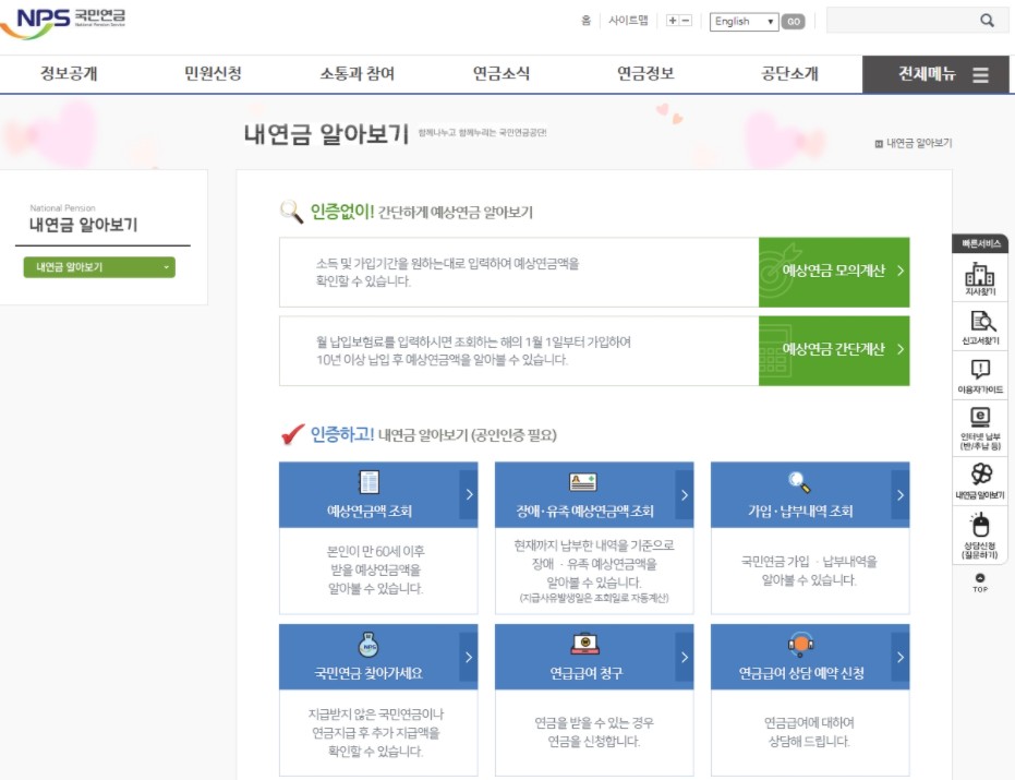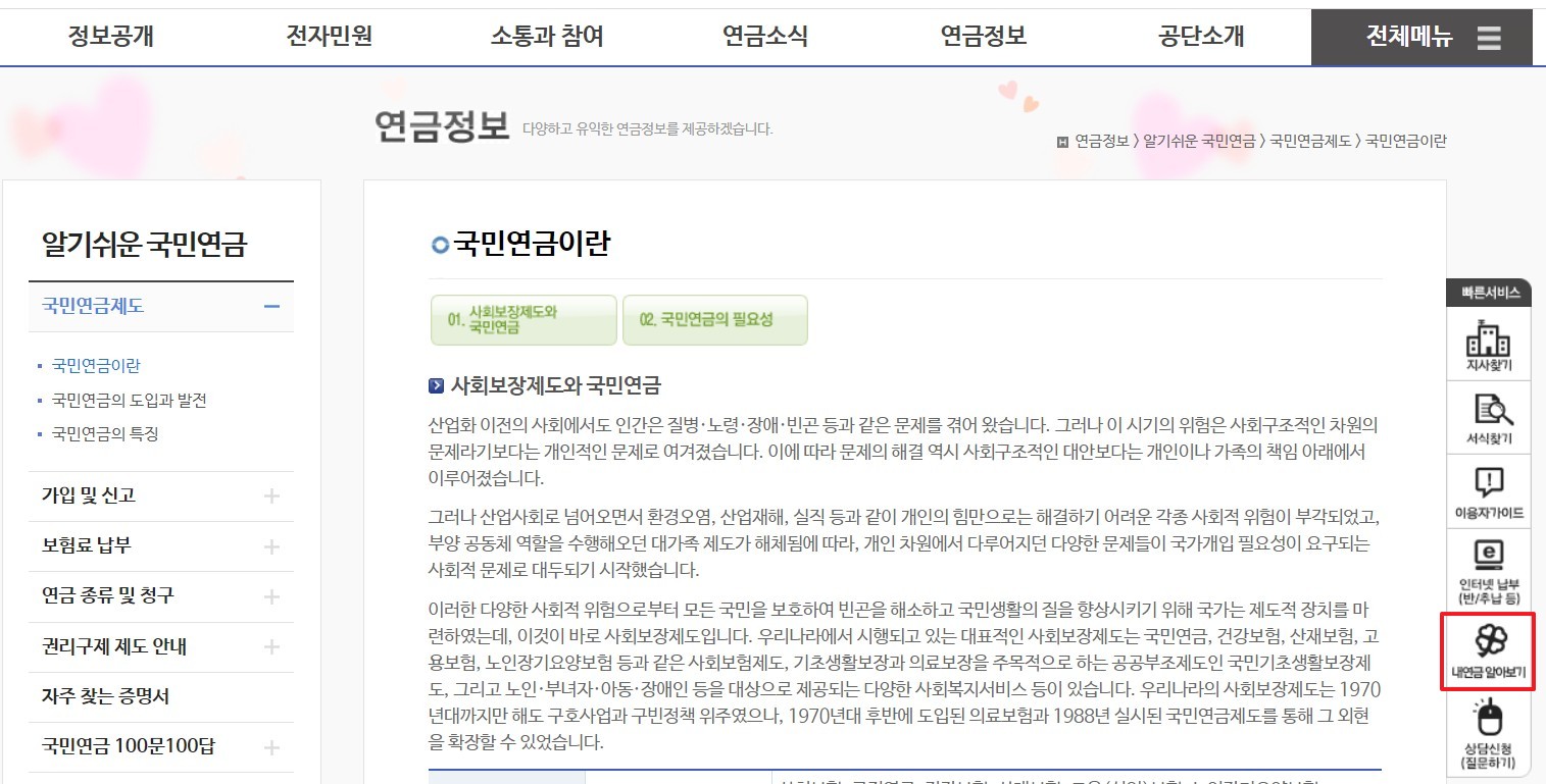 홈페이지에서 아무 곳이나 들어가시면 우측에 빠른 서비스가 있는데요, 아래쪽에 내 연금 알아보기 메뉴가 있습니다.
