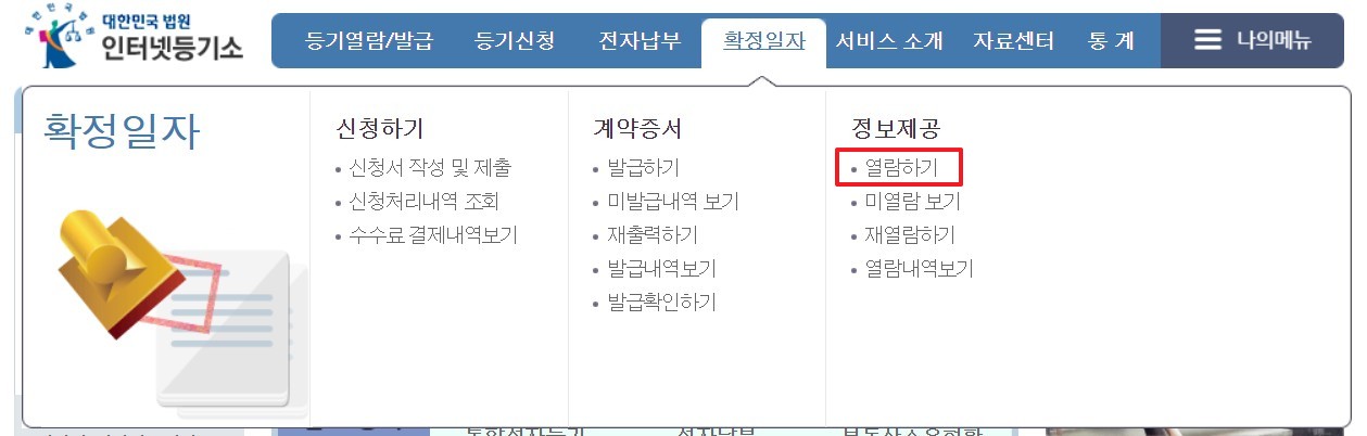 사진과 같은 메인 화면을 볼 수 있는데요, 상단의 메뉴 중에 확정일자 메뉴를 클릭합니다.