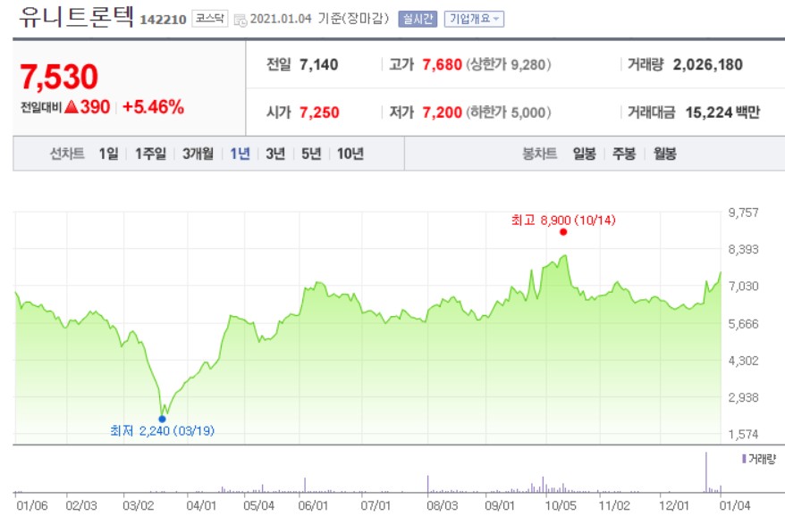 유니트론텍 현재 주가는 7530원입니다. 최근 1년간 유니트론텍 주가를 봤을 때 주가의 상승률은 약 10% 정도입니다.