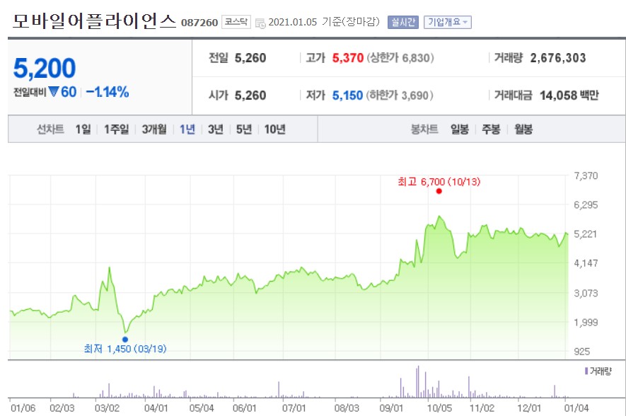 모바일 어플라이언스의 현재 주가는 5200원입니다. 부채비율이 낮은 것은 상당히 안정적이나 자산규모가 낮은 점은 아쉽네요.