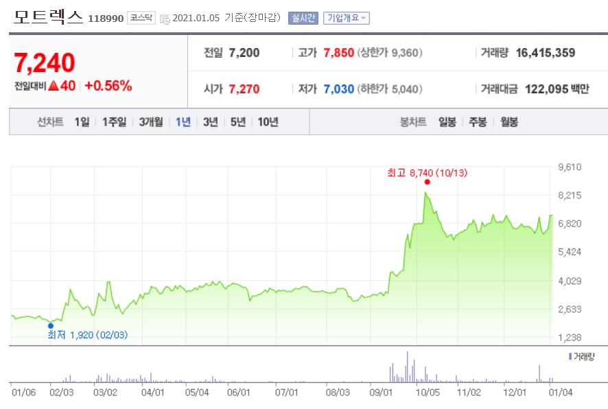 모트렉스의 주가는 7240원인데요, 시가총액이 2527억원 수준으로 최근 3년간 매출은 늘었지만 당기순이익이 큰 폭으로 하락했습니다.