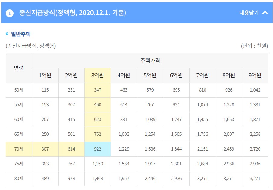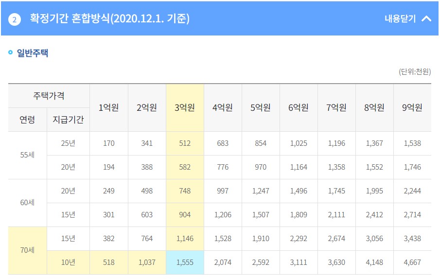 주택연금 지급방식은 총 4가지 방식이 있구요, 표에 나와있는 나이와 금액으로 주택연금 수령액을 계산할 수 있습니다.