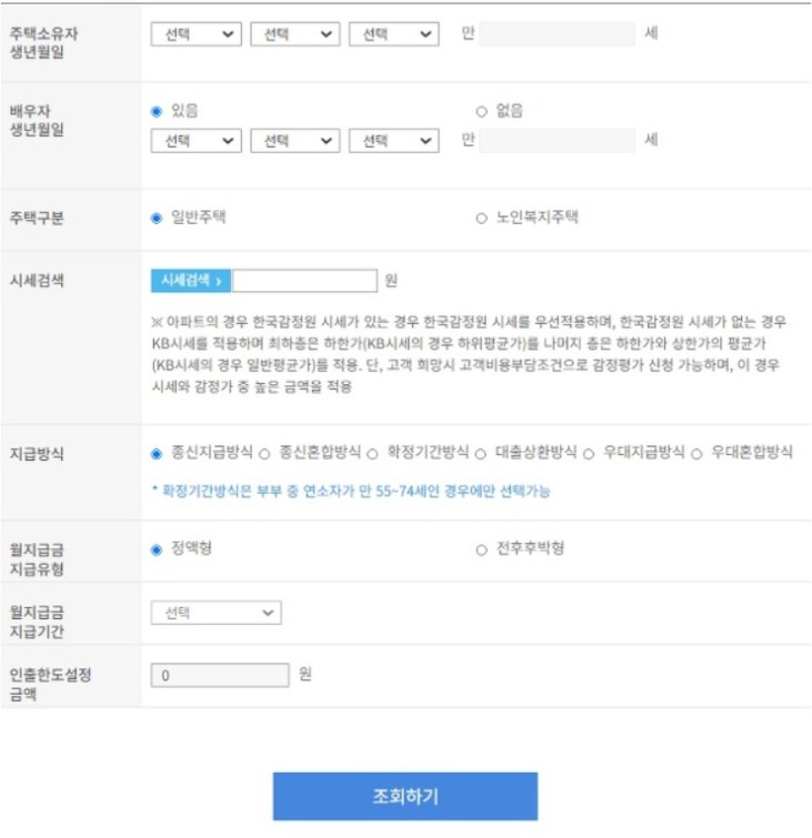 그러면 위와 같은 화면이 나오는데요, 주택소유자와 배우자의 생년월일, 주택구분과 시세검색, 지급방식등을 선택하면 주택연금 수령액 조회가 가능합니다.