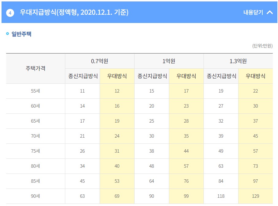 우대지급방식과 우대혼합방식이 있는데요, 우대지급방식은 인출한도 설정 없이 우대받은 월지급금을 종신토록 지급받는 형식이구요, 우대혼합방식은 인출한도 설정 후에 나머지 부분을 우대받은 월지급금으로 종신토록 지급받습니다.
