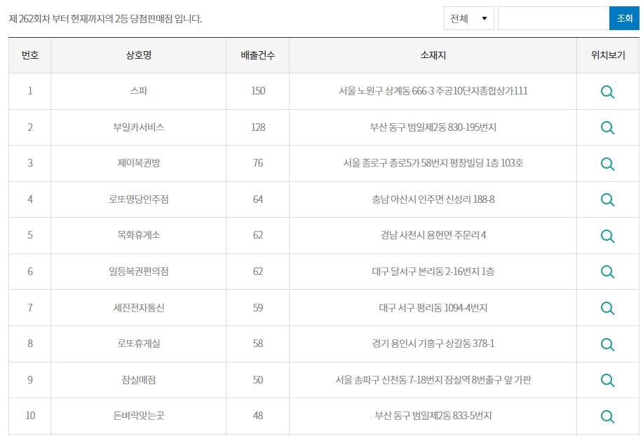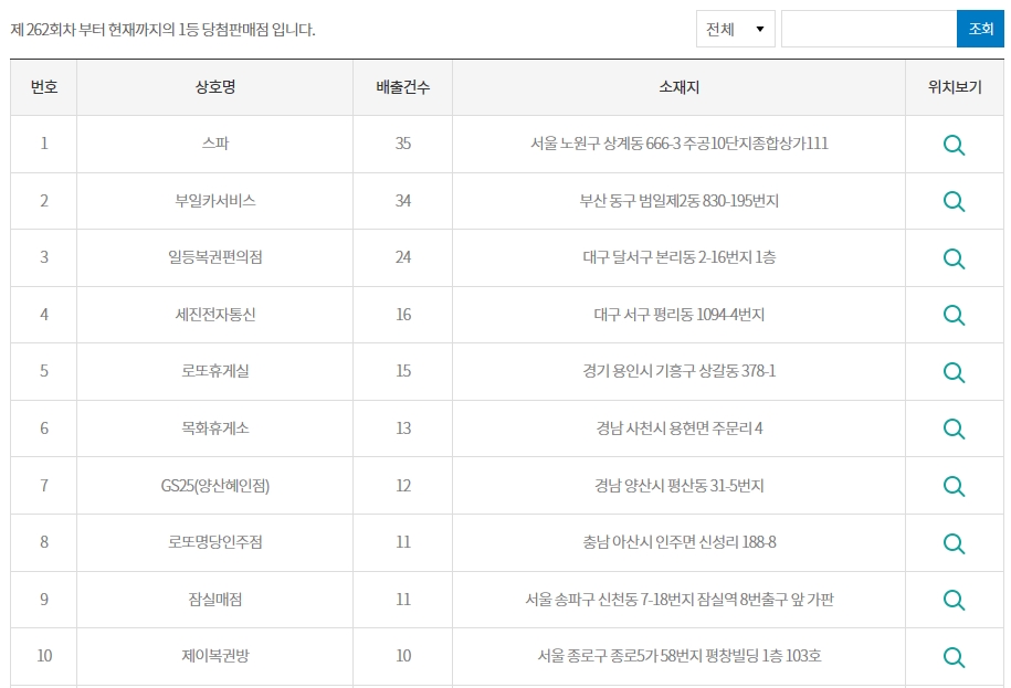 생각보다 1등 판매점이 굉장히 많네요. 10등까지만 추려봤는데요, 서울 노원구의 스파는 배출건수가 굉장히 많아요. 여긴 사람들 엄청 줄서있을 것 같습니다. ㅎ