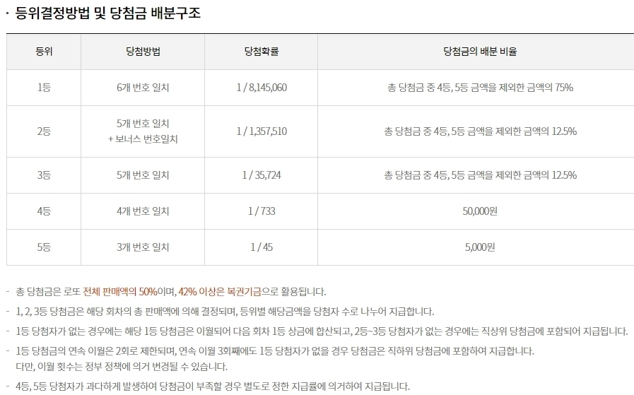 여기서는 로또에 대한 여러 정보를 알 수 있는데요, 가장 먼저 당첨금 배분구조부터 알아볼게요.