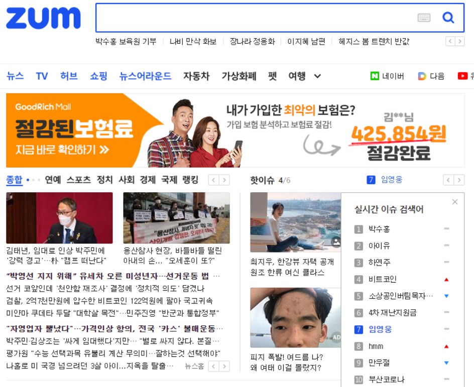 1. 실시간 검색어 사이트 줌(ZUM)