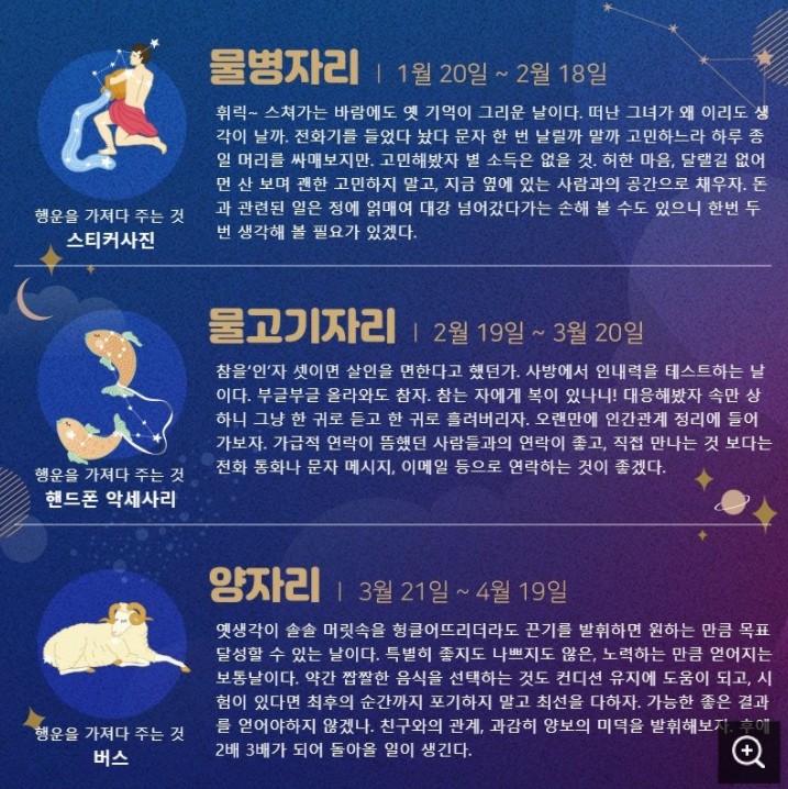 잘 보시면 해당 별자리에 대한 운세가 나와있고 행운을 가져다 주는 물건도 있는데요, 저 같은 경우는 물병자리의 스티커 사진이 행운을 가져다 준다고 하니 스티커사진을 준비해야겠습니다.