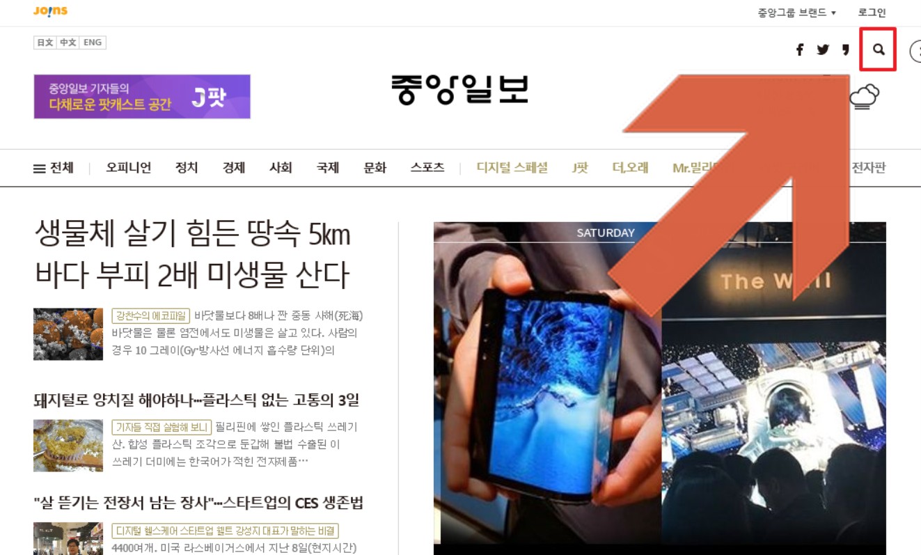 중앙일보에 들어가시면 아래와 같은 메인 화면을 보실 수 있습니다.