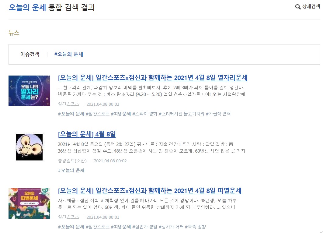 중앙일보 오늘의 운세에서는 재물, 건강, 사랑, 길방에 대한 간단한 코멘트를 볼 수 있구요, 띠별 운세에서는 1~2마디의 코멘트로 띠별 운세를 간단하게 정리했으니 둘 다 보시면 좋겠습니다.