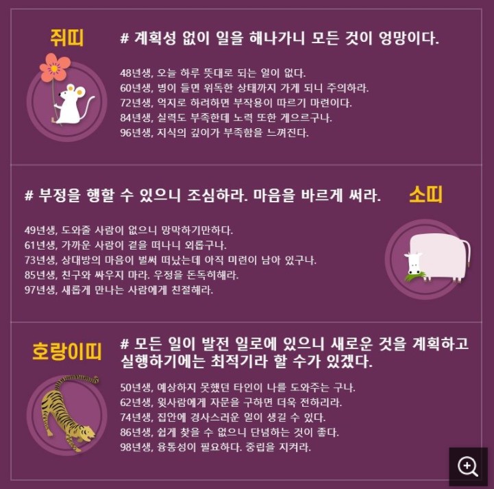 오늘의 운세와 띠별 운세는 띠를 기준으로 본다는 점에서는 큰 차이가 나지 않습니다만 다른 점은 오늘의 운세에서 80대이신 분들의 운세도 확인하실 수 있다는 것입니다.