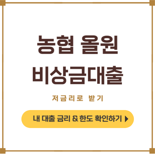 누구나 저금리로 받을 수 있는 비상금대출을 소개합니다. 농협 올원 비상금대출 조건, 후기, 거절 사유, 중단에 대해 궁금하신 분은 농협 올원 비상금대출 신청방법을 클릭하세요.